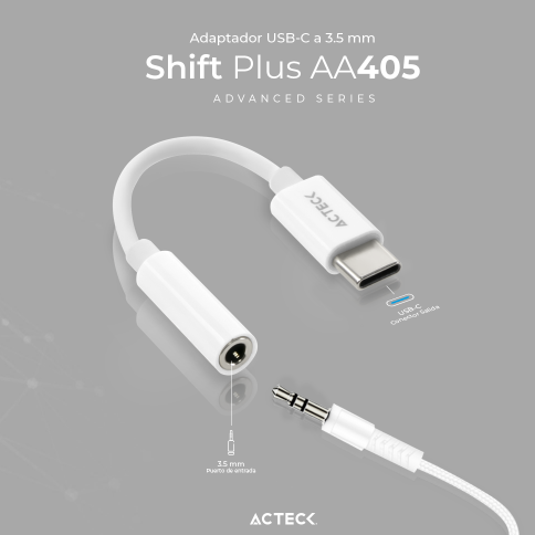 Adaptador USB Tipo C a Jack 3.5mm Shift Plus AA405 Acteck Advanced Series Largo del cable 11cm Para Auriculares Macho a Hembra Blanco AC-934831