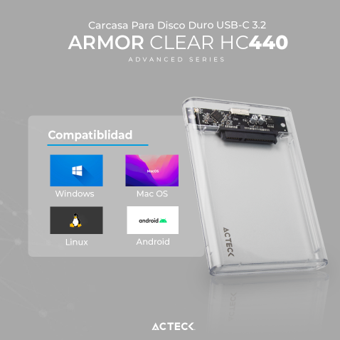 Carcasa Para Disco Duro USB 3.2 ARMOR CLEAR HC440 Acteck Advanced Series Conexión USB Micro B a Tipo A 3.2, Largo del cable 30cm, Velocidad de transferencia: 5 Gbps, Compatibilidad: Discos 2.5", color Transparente. AC-934695
