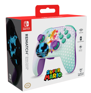 Nintendo Switch, Switch Lite, Switch OLED y Switch 2 (Botón C no disponible) Inalámbrica de baja latencia, alcance hasta 9 m Recargable, hasta 40 horas de juego por carga Cable USBC de 1 m Controles de movimiento integrados, dos botones traseros asignables Ergonómico, agarre texturizado, edición que brilla en la oscuridad Control inalámbrico Rematch™, cable USBC de 1 m, folleto de inicio rápido 160 × 135 × 65 mm 360 g Mario Invencible (Glow in the Dark