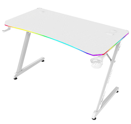 Escritorio Gamer Ergonómico Olympus Spot Glow Pro MRX8000 Balam Rush Legend Series Escritorio Gamer Ergonómico 120 x 60cm, Iluminación RGB, Porta Vasos, Gancho para Auriculares, Soporta hasta 100 Kg Melamina con Acabado de Fibra de Carbón, Estructura Z Color Blanco. BR-941389