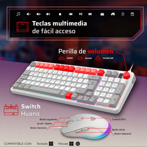 Kit Teclado y Mouse Squad Conquest MG515 Balam Rush Azender Series Teclado y Mouse Alambrico Iluminacion RGB, Dpi Mouse 1200/1800/2400/3600/4800/7200, Teclas Anti-ghosting, Compatible Windows/Mac, Conector USB-A a USB-C Color Blanco. AC-940450