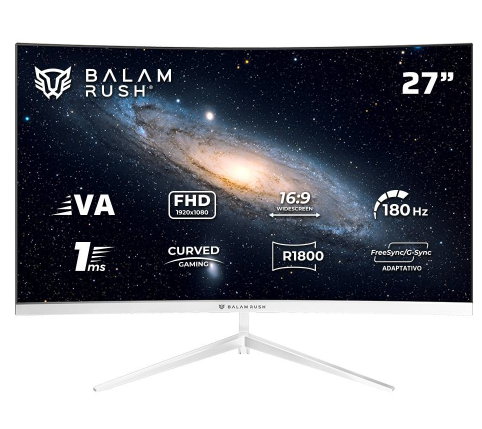 Monitor Gaming Curvo 27" 180hz: ANDROMEDA MAG27Y Balam Rush FreeSync/G-Sync Adaptativo, Panel: 27'' Curvo, Resolución: 1920 x 1080 (Full HD) Frecuencia: 180 Hz Nativo / 200 Hz Overclok, Respuesta: 1 ms, Puertos: 1 x HDMI 2.1 + 1 x Display Port 1.4 + 1 X Tipo C + 1 x Audio 3.5, DC. Montaje VESA 100x100 mm, Ajuste (inclinación) Frontal 5° / Trasero 15°. Longitud de cable alimentación 1.5m. RBG 80% Color Blanco. BR-942997