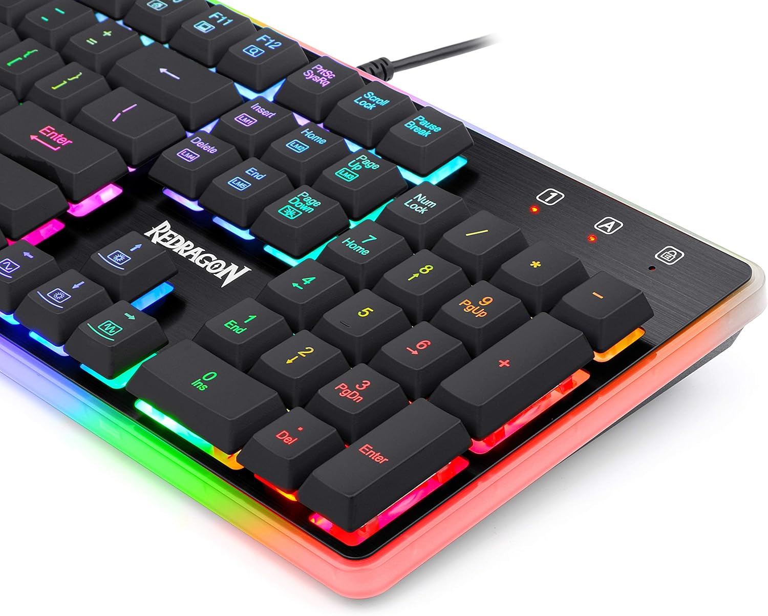 Teclado de juegos retroiluminado LED RGB; el teclado LED RGB K509 Redragon es un teclado retroiluminado en 6 modos de retroiluminación diferentes, múltiples colores, 4 niveles de brillo de retroiluminación y velocidad de respiración ajustable, la iluminación se puede apagar completamente. Retroiluminación ambiental única del borde del teclado que rodea todo el teclado cambiando de color en sincronización con toda la retroiluminación de la tecla